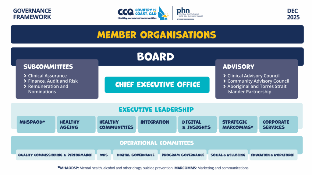We’re structured to stay independent, transparent and accountable to the communities we serve. Legally, CCQ is the trading name of Sunshine Coast Health Network Ltd, a company limited by guarantee and a registered charity with the Australian Charities and Not-for-profits Commission (ACNC). We’re governed by a Board of Directors elected by our member organisations and guided by our Constitution. Each year, we hold an Annual General Meeting to report back and keep our community informed.
