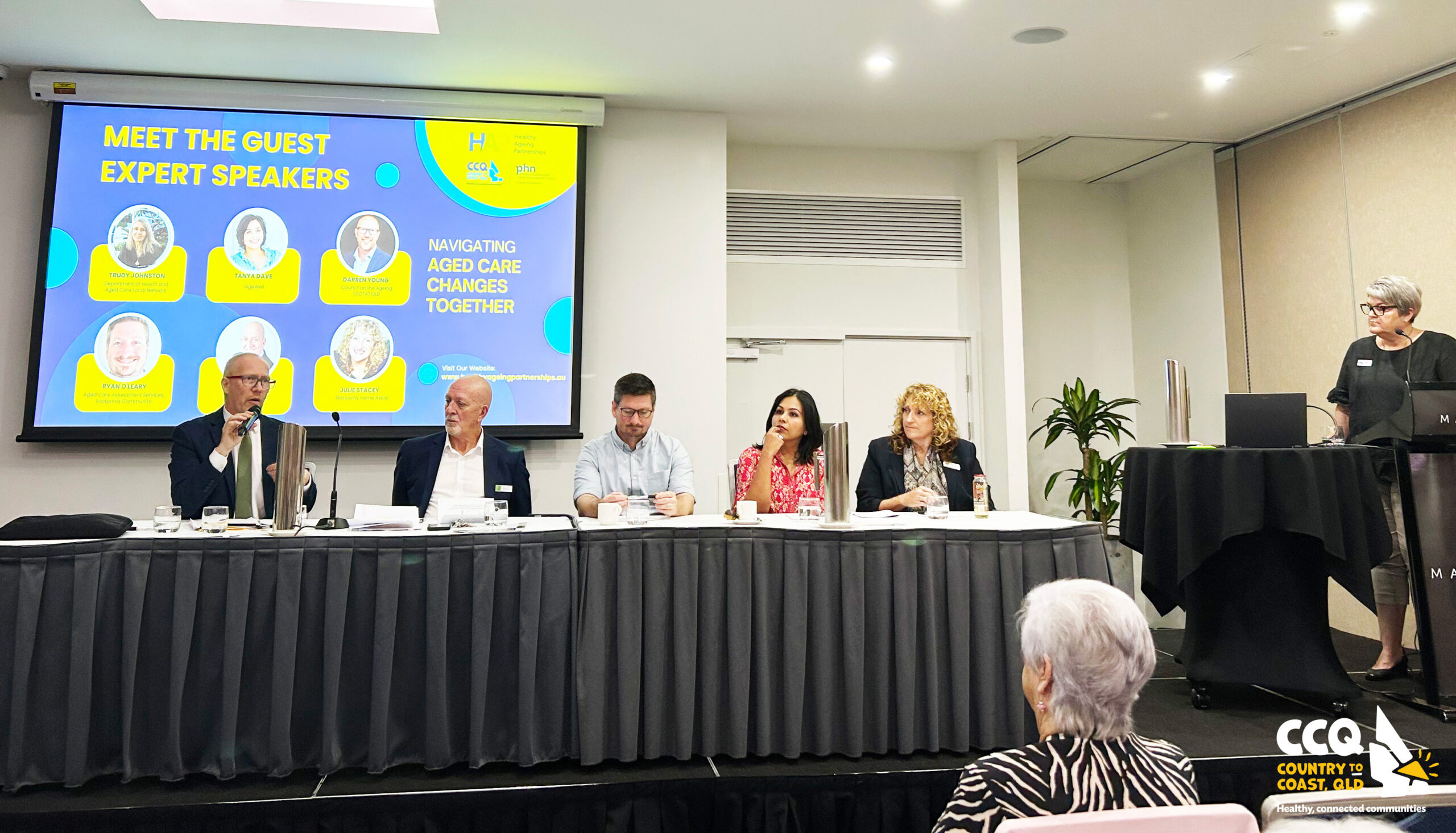 Caption: The panel of Healthy Ageing Partnership guest speakers answered questions about navigating aged care reforms from the 150 attendees at the event.