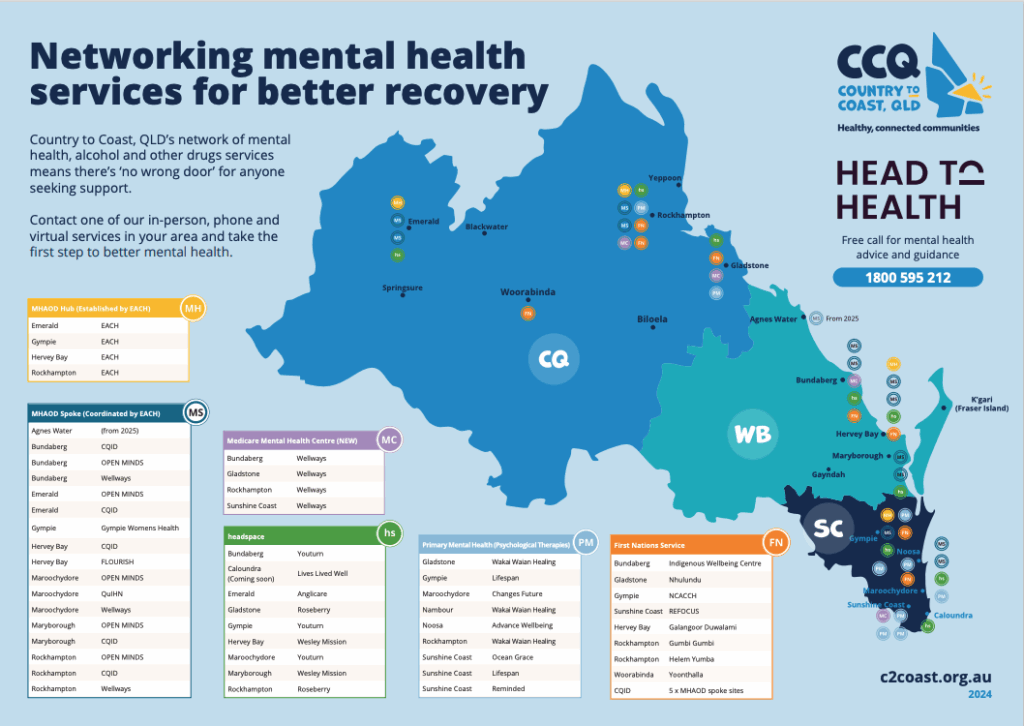 From 1 October 2024, a new networked model for MHAODSP services funded by Country to Coast, QLD, is operating across the Central Queensland, Wide Bay, and the Sunshine Coast.